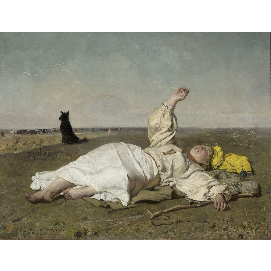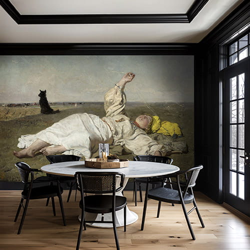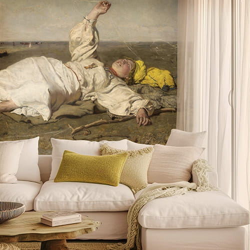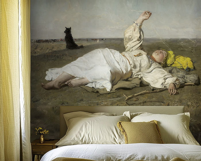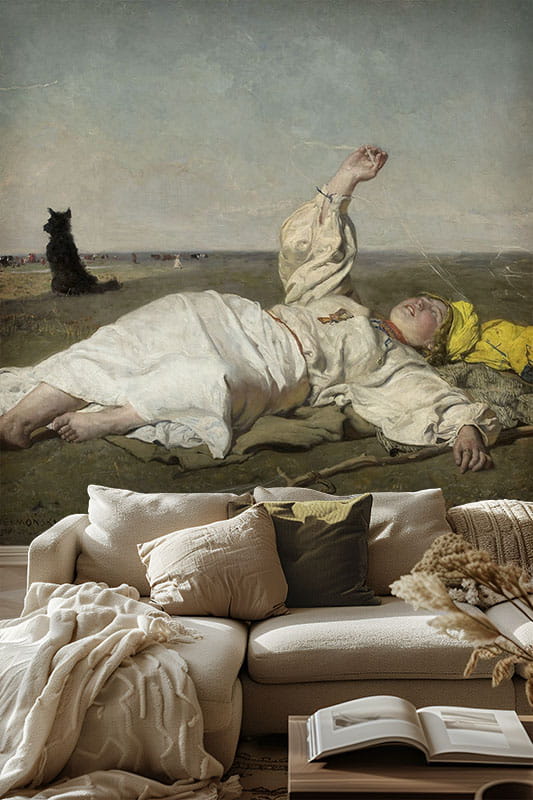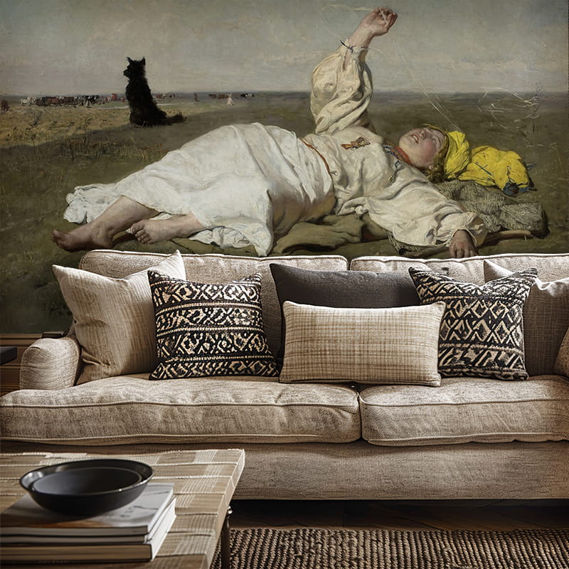 Na obrazie widzimy młodą kobietę odpoczywającą na łące, zanurzoną w ciepłym, sielskim krajobrazie dogasających letnich dni. Delikatne nici babiego lata unoszące się w powietrzu, miękkie światło i bezkresna przestrzeń budują atmosferę spokoju, wolności i lekkiej melancholii. To właśnie ta emocjonalna warstwa sprawia, że tapeta z tym wiejskim motywem tak silnie oddziałuje na wnętrze – wycisza je, otwiera optycznie i wprowadza harmonię.