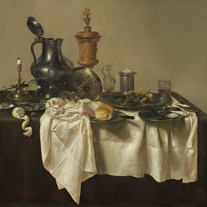 Tapeta ścienna na wymiar z reprodukcją barokowego obrazu Willema Claesza Hedy z 1635 roku to propozycja dla miłośników wysmakowanego stylu i nastrojowych wnętrz. Kompozycja pełna detali - połyskujące stare srebra, grube dekoracyjne szkło, kunsztownie udrapowany obrus - tworzą wyrafinowaną atmosferę, charakterystyczną dla barokowej estetyki Złotego Wieku Holandii.
