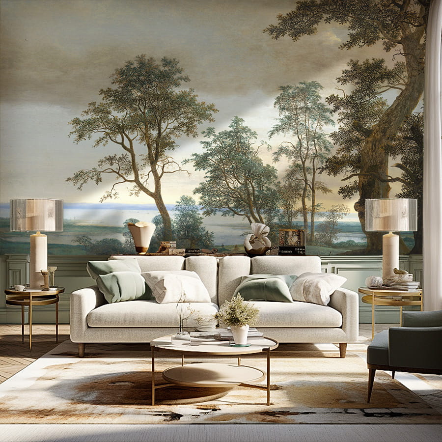 Tapeta z pejzażem barokowego artysty działa na zmysły dyskretnie. Nie narzuca się intensywnością, lecz łagodnie otula przestrzeń, budując nastrój i głębię. Delikatna, wyciszona paleta kolorystyczna działa jak oddech dla wnętrza - miękkie beże, zgaszone zielenie i subtelne szarości płynnie przechodzą w świetliste odbicia na tafli rzeki. Kompozycja o łagodnym rytmie i klasycznej harmonii daje wrażenie porządku i wewnętrznego spokoju.