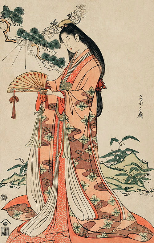Piękna, orientalna tapeta z historycznym portretem kobiety w ozdobnym kimonie, będąca reprodukcją drzeworytu Hosody Eishiego "Sotoori Hime", z 1796 roku. Dzieło przedstawia legendarną księżniczkę z IV wieku, znaną ze swej niezwykłej urody i japońskich, romantycznych opowieści.