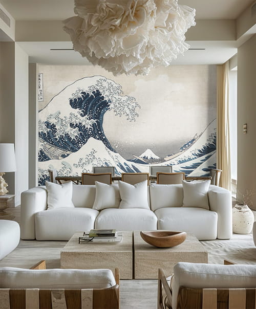 Tapeta Hokusai to nie tylko orientalna dekoracja ścienna - to nośnik kulturowego przekazu i ponadczasowego piękna. Idealnie wpisuje się w japoński styl wnętrz oraz aranżacje japandi, czy wabi-sabi, gdzie ceni się prostotę, naturalność i harmonię.