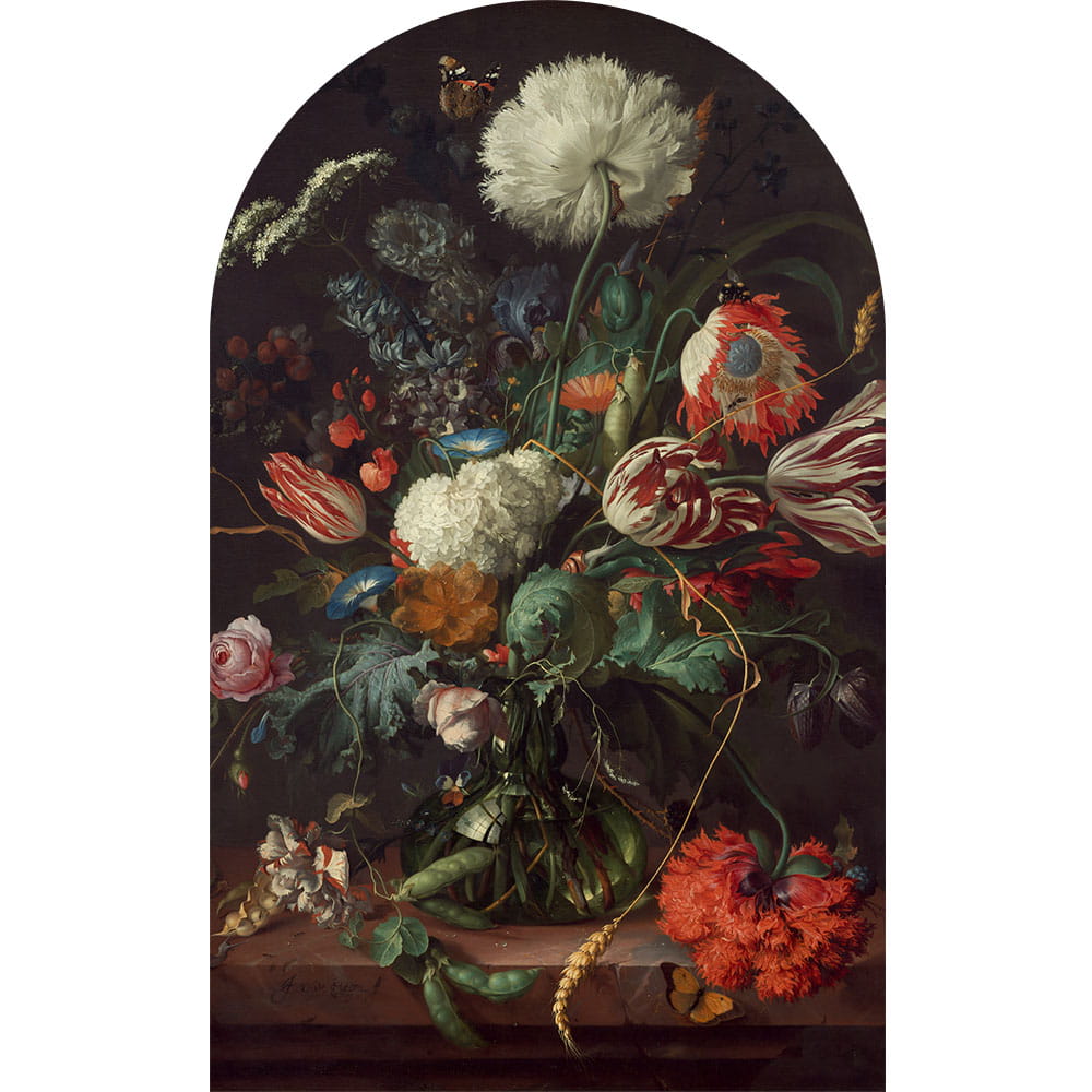 Florystyczna kompozycja z XVII wieku autorstwa Jana Davidsz de Heema zachwyca szlachetną paletą barw, różnorodnością gatunków i głębią światłocienia. Wysoki, pionowy format tapety doskonale podkreśla walory barokowego malarstwa i sprawia, że dekoracja przypomina portal zapraszający do świata sztuki dawnej - pełnej wytworności, elegancji oraz wyszukanej, maksymalistycznej estetyki.